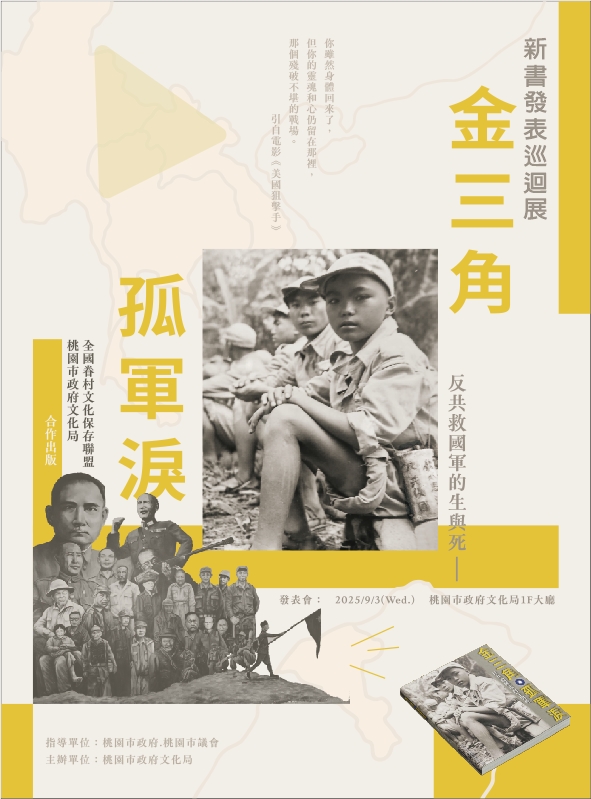 | 說明:一、由桃園市政府文化局與全國眷村文化保存聯盟共同出版的《金三角孤軍淚-反共救國軍的生與死》,聚焦38年國軍退守金三角的歷史,透過口述訪談與珍貴影像,真實呈現雲南反共救國軍在泰緬邊境三十年的奮戰歷程,歡迎有興趣的民眾至馬祖新村參觀「孤軍淚新書發表巡迴展」。 二、展覽資訊如下: (一)時間:114年11月1日(星期六)至11月30日(星期日)每週二至週日上午9時至下午6時,免費入場。 (二)地點:馬祖新村眷村文創園區「馬村實驗藝廊」(桃園市中壢區龍吉二街155號1號眷舍)。 (三)歡迎各級學校師生配合108年課綱,結合公民與社會、地理、歷史及環境教育議題進行跨科戶外教學(預約導覽請洽03-2841-866)。 三、更多訊息請至馬祖新村眷村文創園區臉書查詢(https://www.facebook.com/share/p/1CBmsY3fUo/)。 |